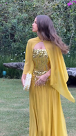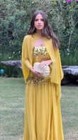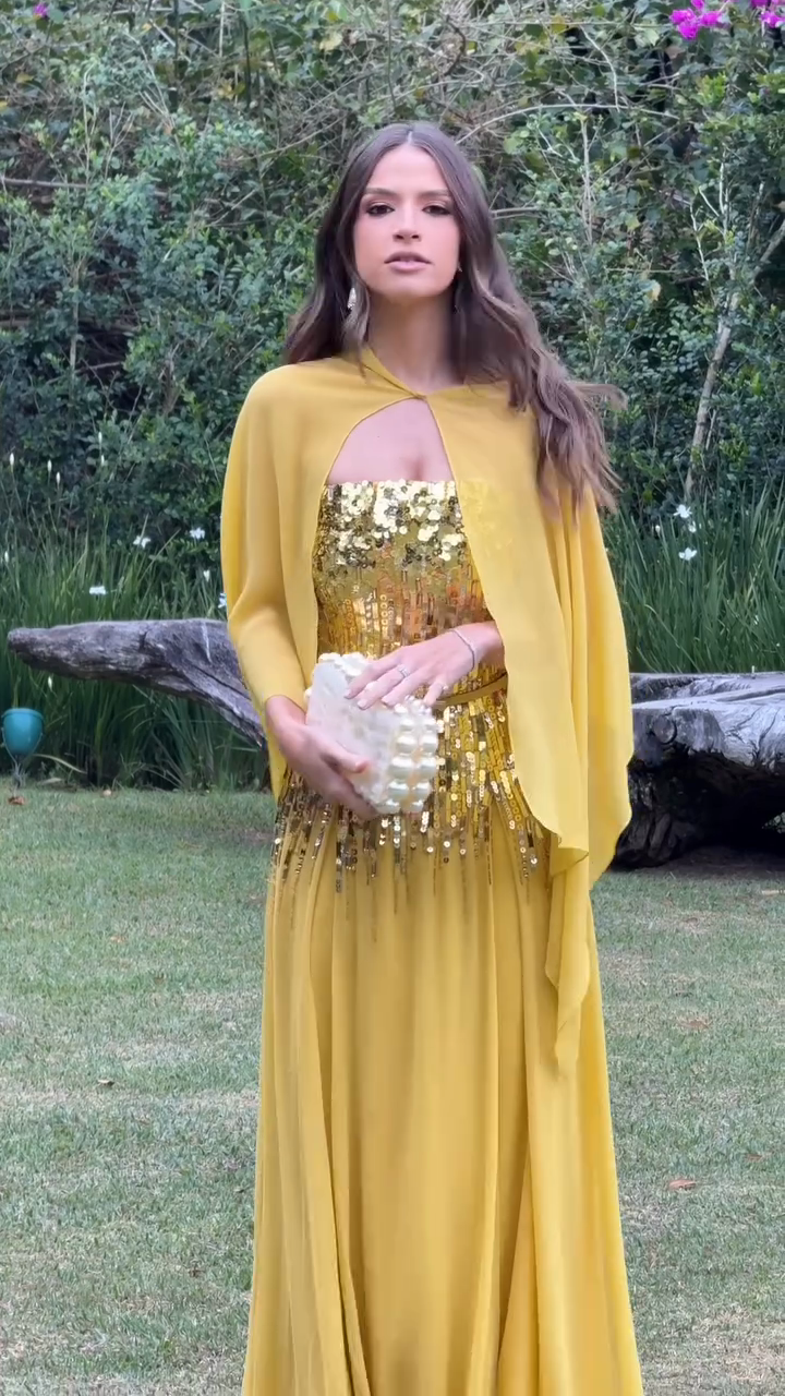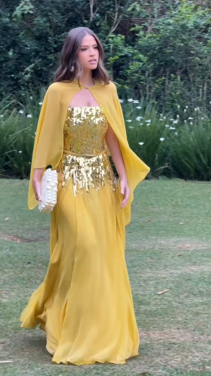 This yellow dress is truly eye-catching. The bodice is embellished with gold sequins (which shimmer in the light), while the skirt is crafted from smooth yellow fabric. The matching yellow cape adds a touch of sensuality. This stunning and elegant gown, crafted from metallic sequins and chiffon, is perfect for formal occasions like dinners and parties.