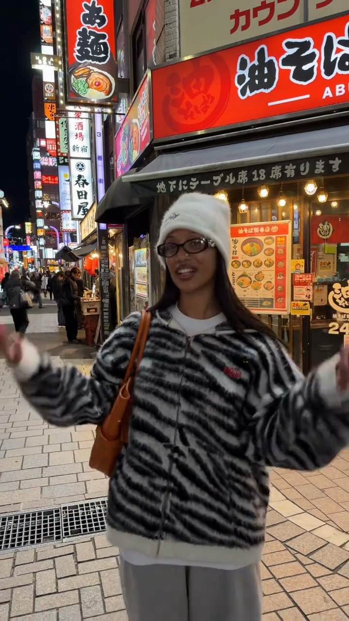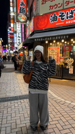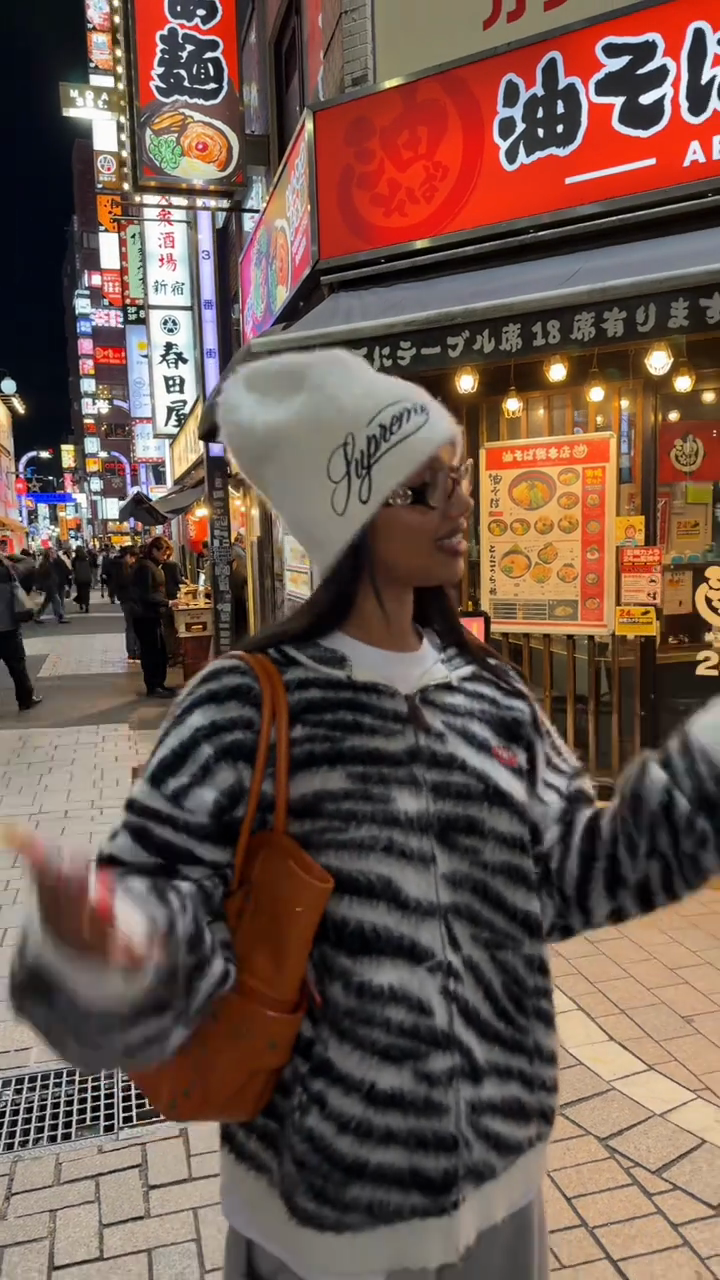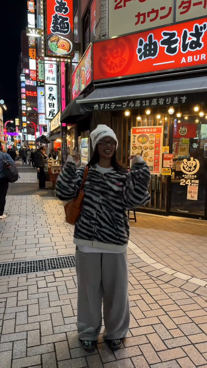 This jacket features a striking black and white zebra print knit fabric, a full zipper, and a comfortable, versatile loose fit. It's easy to style for both casual outings and streetwear looks, exuding a playful yet comfortable vibe. Pair it with a white knit hat and a brown leather bag for an effortlessly chic and stylish look.